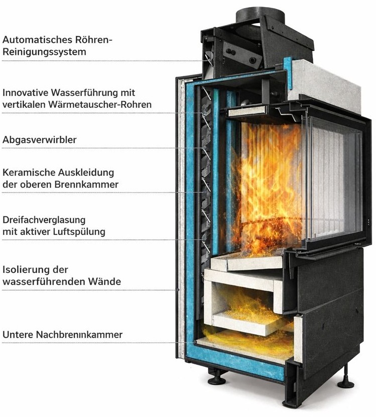 Der Kamin besitzt einen doppelwandigen Wärmetauscher (Wassermantel), durch den Wasser kontinuierlich fließt.